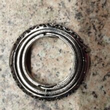 I really like this ring in concept. The various rings that open at different angles make a really cool accessory. I find myself taking it off to play with it often. The other day I noticed that the bit of discoloration that I'd noticed earlier on the inner layers was actually around a hole. A hole that should have a pin in it securing these rings to the outer ring. So now the two inner rings are attached to the outer one by only one pin, opposite where the other should be. I suspect it's only a matter of time before the other pin fails too.